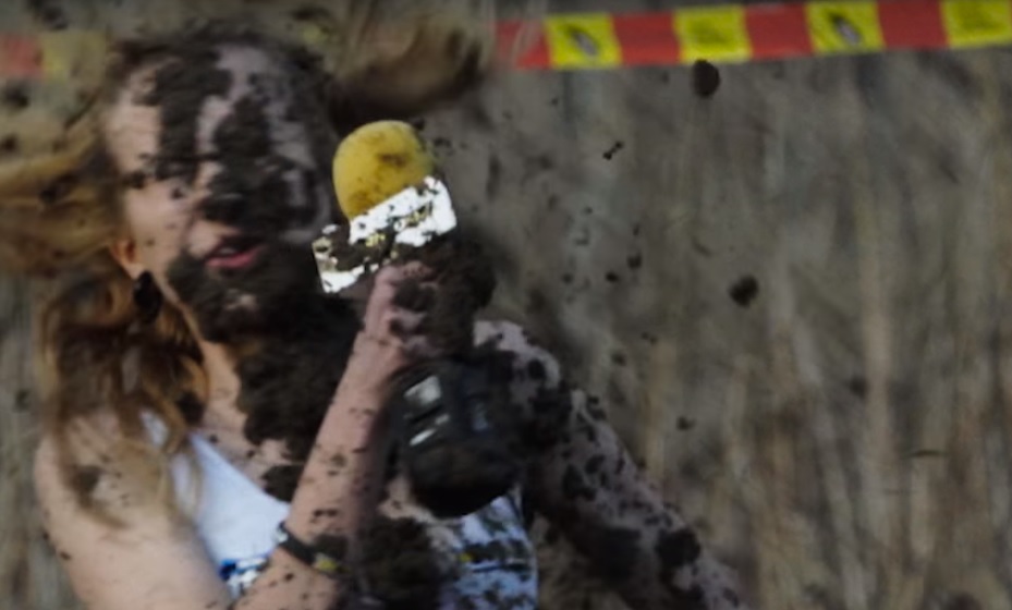 Само смях за тази лейди, брато. Не е достатъчно просто да държиш микрофона и да чупиш стойки. Репортерката се опитва като всичките й тъпи колеги да предаде нещо ексклузвино от мястото на събитието. Само че събитието е… в кал. Изпитваме огромен кеф да гледаме как отнася 2 кофи кал…
