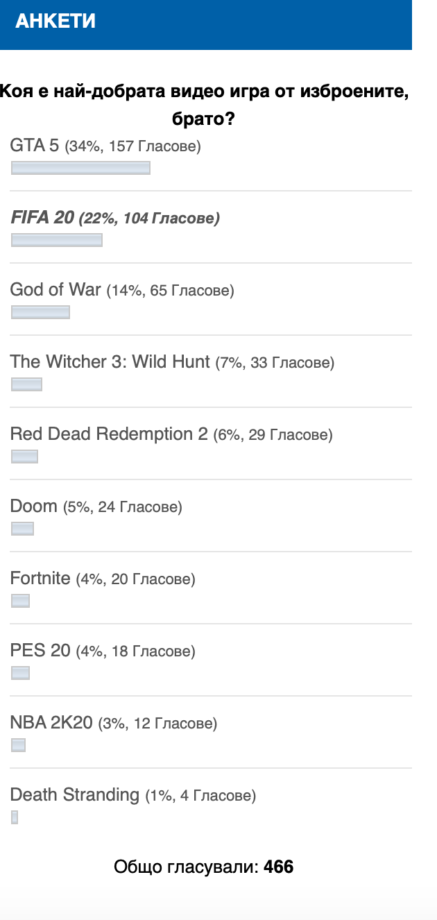 От 10 възможности GTA събра 34% от гласуващите, изпреварвайки чувствително FIFA20 (22%). Трети в класацията остана God of War с 14%.