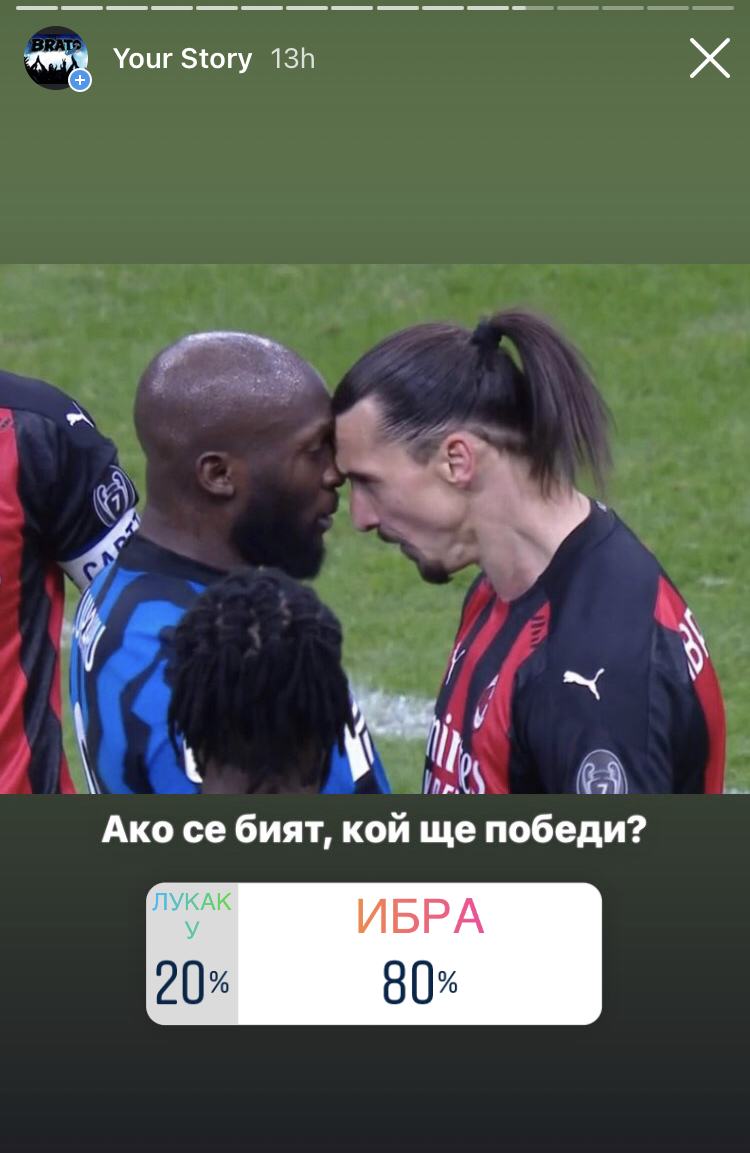 Това породи у нас въпроса кой би победил в сблъсък един в един. Лукаку е от категорията на 39-годишния нападател, който обаче има черен колан по таекуондо. За да не разтягаме излишни локуми, попитахме нашите читатели и във фейсбук, и в инстаграм. И на двете места бяха единодушни – играчът на Интер няма шанс. За шоуто ни се иска такъв мач да се състои в даден момент, а рейтингът му ще бъде по-голям и от носа на Ибра. Шегуваме се, бат Ибра, не ни бий, ние те харесваме.