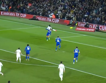 Този го застреля, сър. Мачът е между Лийдс и Кардиф. Ударът е световна класа.