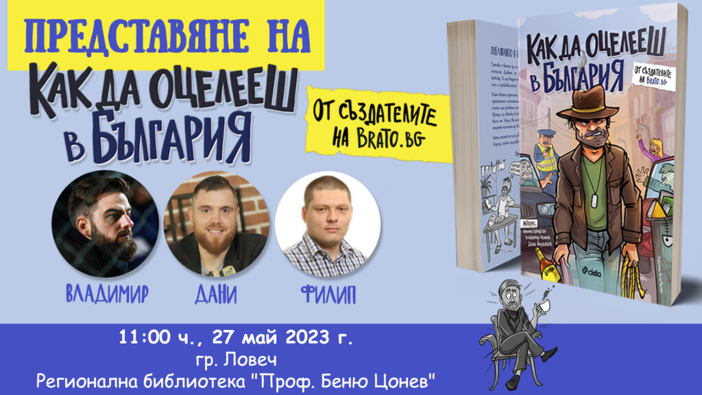 На 27 май от 11 часа екипът на Brato.bg ще прекрачи прага на регионалната Библиотека “Проф. Беню Цонев”, за да си поговорим за забавни неща, защото не сме фенове на негативното. Тема №1 ще е книгата ни “Как да оцелееш в България”, която вече навърши 1 година, но продължава да се учи и да ни учи. Четивото съдържа практични и изпитани съвети, подбрани от топ експерти, с които ще развиеш полезни умения за оцеляване на сватба, в такси, без пари, в дълга връзка, в “Люлин”, Враца и др. Нарисувани от Неда Малчева, ситуациите в книгата ще ти се сторят познати до болка… къде от смях, къде не.